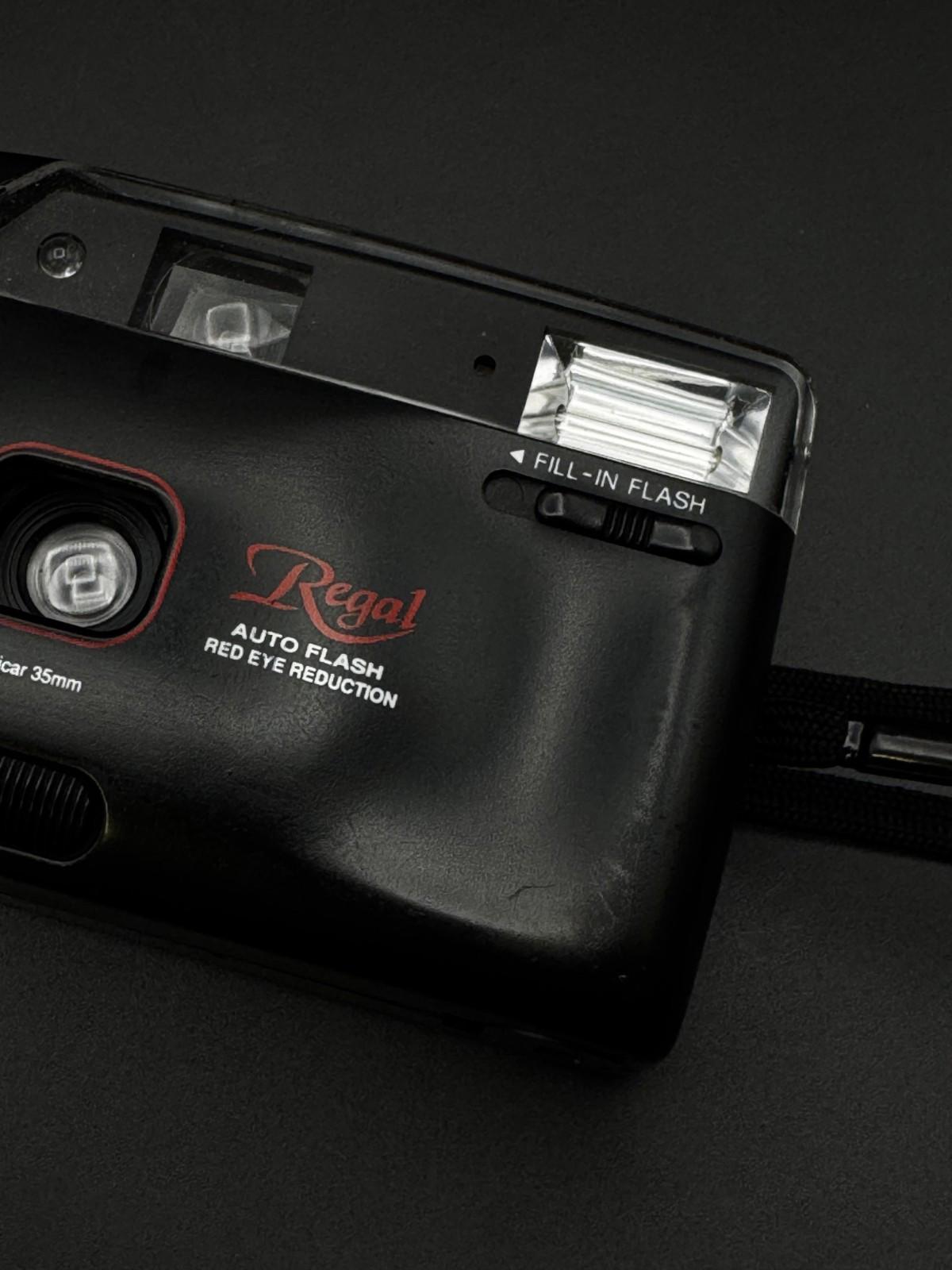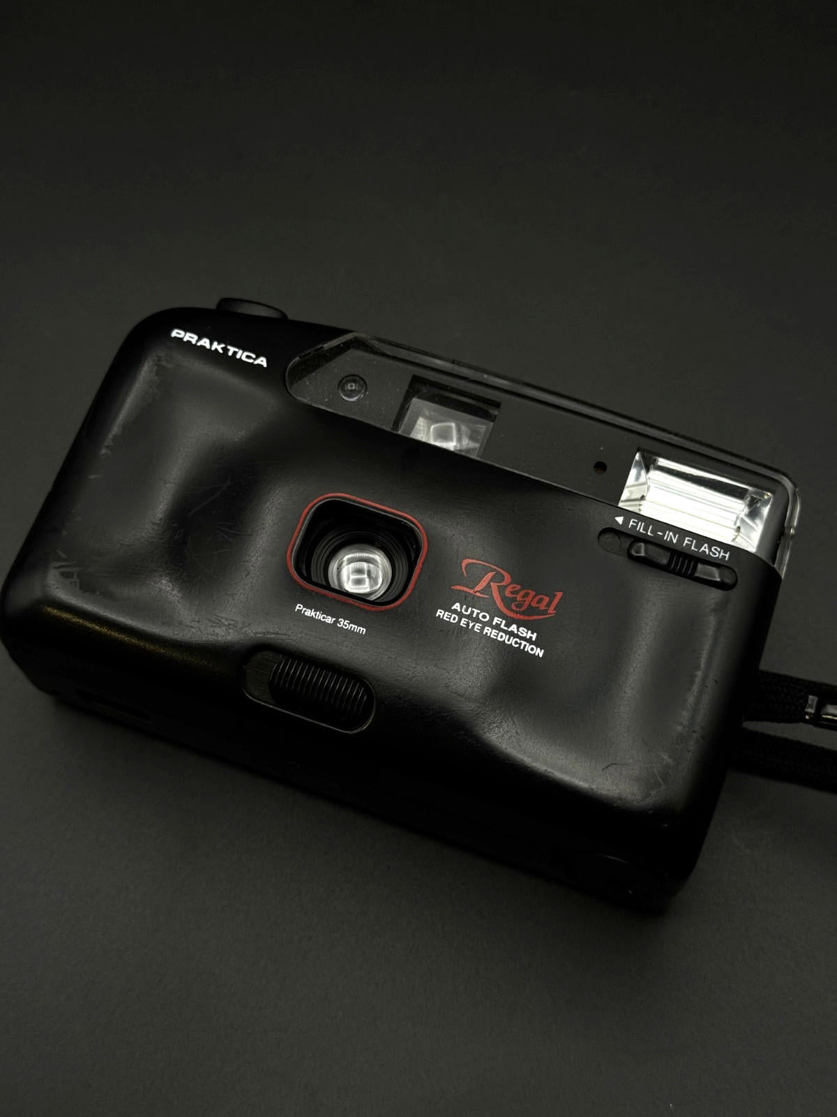 The vintage Praktica Sport Regal 35mm compact film camera is a point-and-shoot style camera with a fixed focus. It features a built-in flash and red-eye reduction capabilities, making it a convenient choice for capturing images on 35mm film.